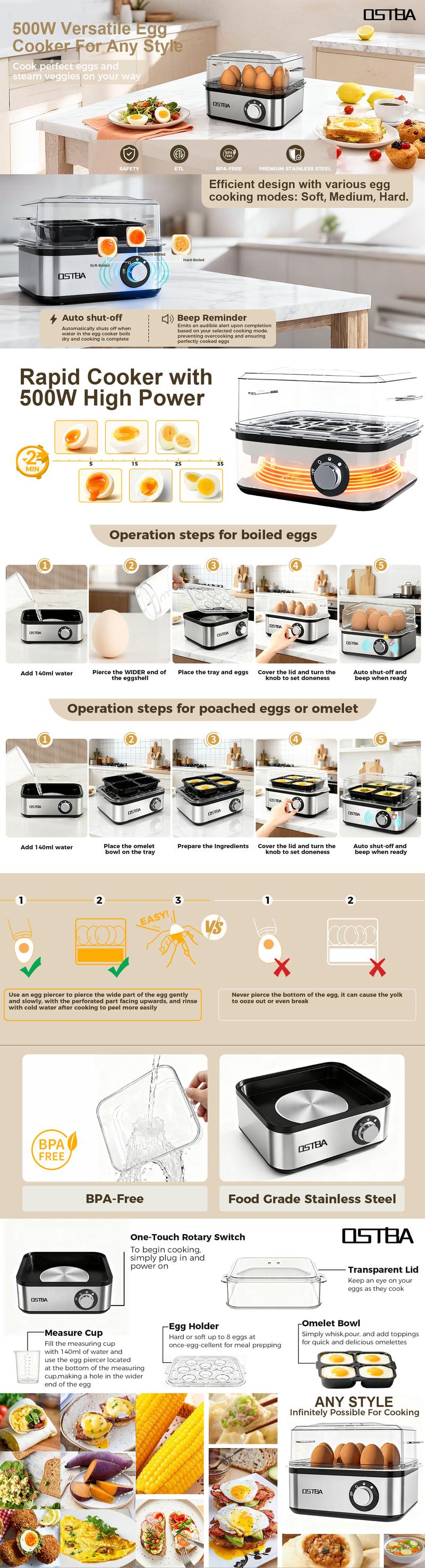 Upgrade your kitchen with the OSTBA 500W Egg Cooker. It combines functionality with safety. Perfect for anyone looking for a reliable egg cooker. 🏠